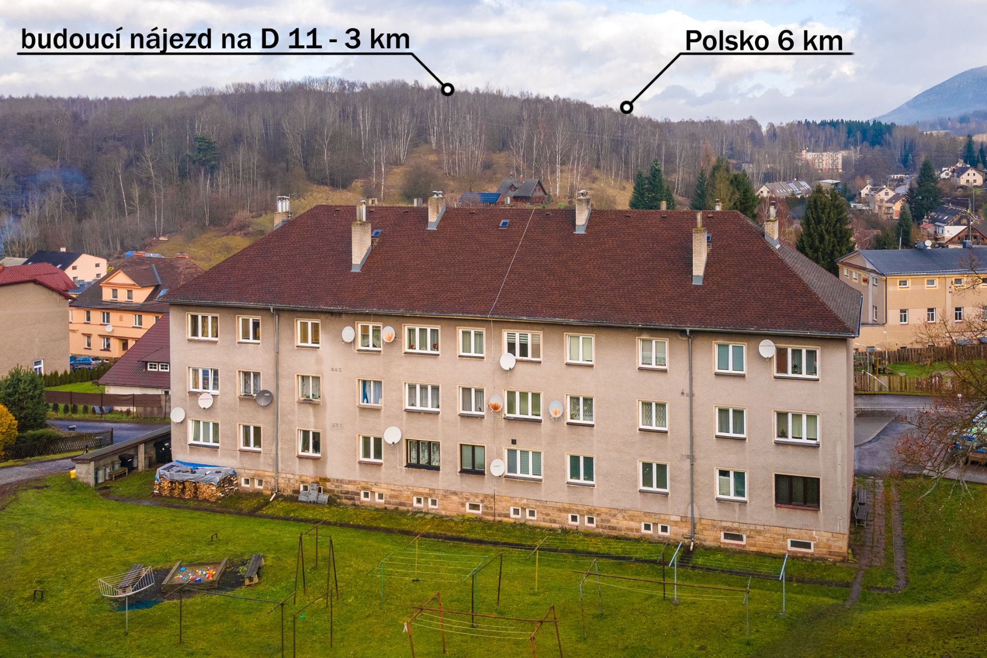 - nová dálnice D11 – sjezd pouhé 3 km od bytu, dokončení plánováno na rok 2027